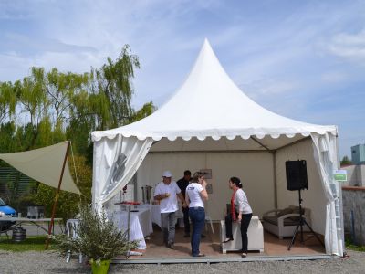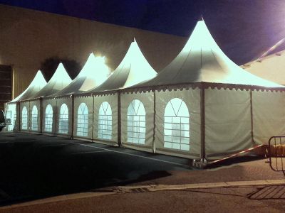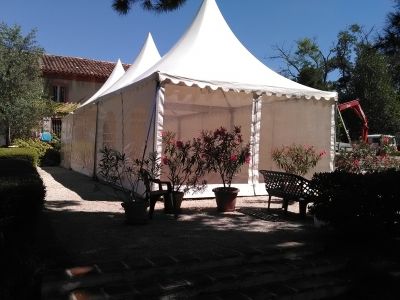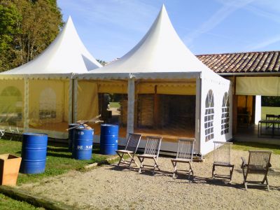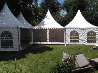 Les pagodes sont des tentes élégantes qui peuvent être facilement modulées pour réaliser une espace aussi pratique qu'esthétique. Il est possible de juxtaposer de façon étanche plusieurs tentes en carré, en rectangle, en U voire en L.